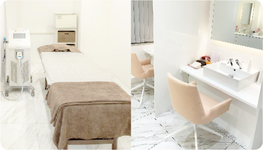 カウンセリング・初診・再診料・初回照射0円。肌トラブルの際は医師が対応。全身が1時間で完了。パウダーコーナーにアメニティを充実。ベッドシーツは毎回交換で清潔